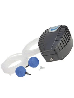 Rückschlagventile ermöglichen den Betrieb unterhalb des Wasserniveaus. Die Luftfördermenge von 500 Litern pro Stunde strömt über zwei Ausströmersteine, die jeweils über einen 5 m-Schlauch mit der Pumpe verbunden sind, aus. Die Luftmenge versorgt kleinere bis mittelgroße Gartenteiche bis 5 cbm Wasserinhalt ausreichend mit Sauerstoff.