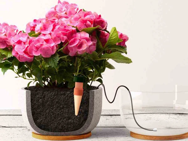 Stecken Sie den Tonkegel einfach in den Blumentopf und füllen ihn einmalig mit Wasser. Danach zieht der Kegel kontinuierlich Wasser aus einem Vorratsbehälter und gibt die Feuchtigkeit an die umgebende trockene Erde im Pflanzgefäss ab.