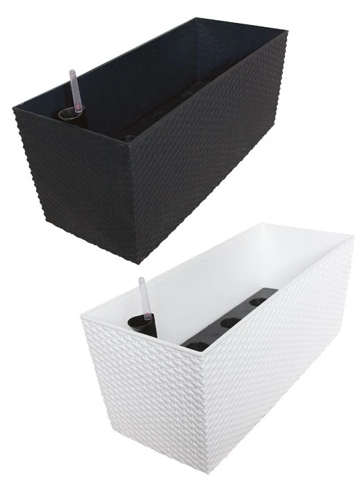 Zum optimalen Bewässern beinhalte der Blumenkasten einen Einfüllstutzen und einen Wasserstandsanzeiger, somit können Sie Ihre Pflanzen nie überwässern. Die Wasserversorgung geht über erdgefüllte Kegel. Der Rato Case Blumenkasten ist in zwei Farben und Größen erhältlich.