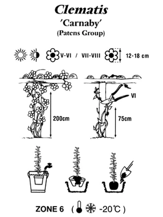Wuchs: Die Clematis ‚Carnaby‘ ist die ideale Pflanze zur Begrünung einer Pergola oder eines Rankgerüsts. Ihr Wuchs ist sehr locker und nicht blickdicht. Dadurch wirkt das Erscheinungsbild der Kletterpflanze so leicht und unbeschwert. Mit ihrem kletternden Wuchs kann die Clematis ‚Carnaby‘ bis zu 2,50 Meter hoch werden. Clematis sind windende Kletterpflanzen, die Zeit ihres Lebens ein Gerüst benötigen.