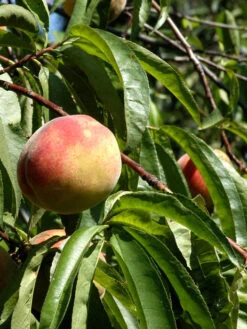 | Frucht: | Mittelgroßer, weißfleischiger Spätpfirsich; grüngelb mit sonnenseits rotem Überzug; dichte Behaarung; Fruchtfleisch fest, aromatisch, mit ausgeprägter Säure; steinlösend. |