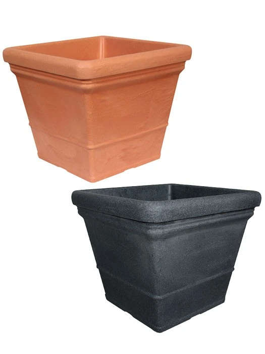 Der Pflanzkübel Parma ist in der Farbe terrakotta oder anthrazit in drei verschiedenen Größen erhältlich. Der viereckige Topf ist recht schlicht, doch sein verstärkter Rand und die Struktur der Oberfläche verleihen ihm ein sehr edles Erscheinungsbild. Durch aufwendige Bearbeitung des Materials sieht der aus Kunststofftopf einem echten Keramiktopf zum verwechseln ähnlich. Neben den optischen Aspekten, steht auch der praktische Nutzen des Kübels im Vordergrund. So ist das Material recycelbar und zudem extrem leicht.