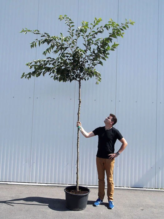 | Lieferqualität: | Junger Hochstamm mit einer Stammhöhe von ca. 2,00 m im Container. Mit einer auf dem Stamm aufsitzenden kleinen Krone, die im Lieferzustand fachgerecht etwas zurück geschnitten ist, um eine gute Kronenentwicklung nach der Verpflanzung zu gewährleisten. Stammhöhe: ca. 2,00 m |