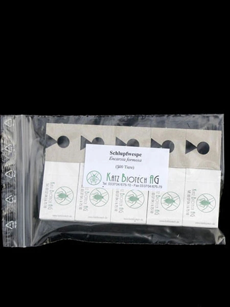 Die neue Schlupfwespe schlüpft wenige Tage nach der Schwarzfärbung und hinterlässt ein winziges kreisrundes Loch in der leeren Larvenhülle. Das 2. Bild in unserer Produktpräsentation zeigt die bereits parasitierten, schwarzen Larvenhüllen.