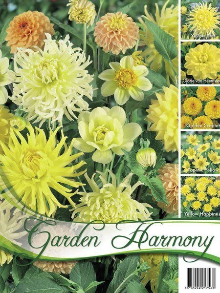 Das Sortiment besteht aus 5 Sorten gelber Dahlien, die aufeinander abgestimmt sind.