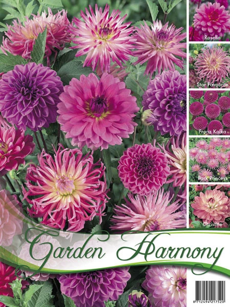 Das Sortiment besteht aus 5 Sorten rosa-farbener Dahlien, die aufeinander abgestimmt sind.