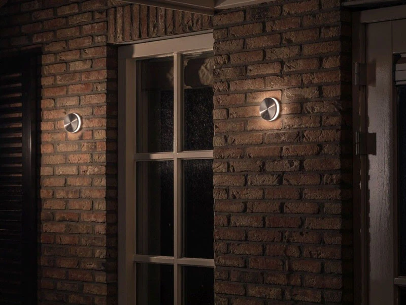 Stilistische Wandleuchte aus Edelstahl die Ihrem Garten oder Terrasse, Haus- oder Wohnwand die besondere Atmosphäre und Tiefe verleiht. Die runde Wandleuchte Aurora hat klare Formen und eine Einheit mit weißer Beleuchtung. Die moderne Hängeleuchte hat einen Verbrauch von 3 Watt bei einer Leuchtkraft von 130 Lumen.
