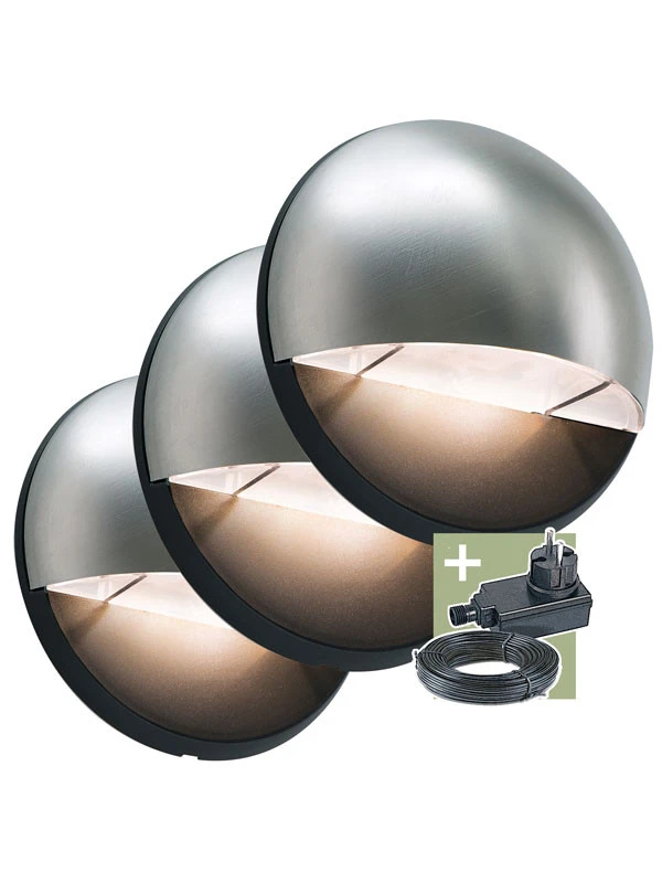 Beleuchten Sie Ihre Wand oder Ihren Gartenweg mit dieser Ludeco Außenleuchte Aron Starter-Set. Diese drei grauen Wandleuchten haben jeweils drei integrierten LEDs und sind durch die sichere Spannungsebene von 12 Volt menschen- und tierfreundlich. Die dezente und minimalistische Leuchte leistet 90 Lumen. Das Starter-Set besteht neben den Aron-Lampen aus einem Trafo und einem 8 Meter langen Kabel.