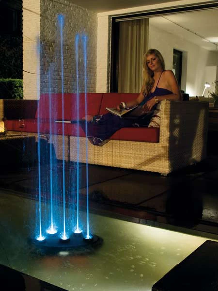 Es verfügt über 5 individuell angesteuerte Düsen, deren Fontänenhöhe und Geschwindigkeit durch fest eingestellte Programme per mitgelieferter Fernbedienung (max. 80 m Reichweite) wählbar sind. Jede Düse ist mit einem hochwertigen LED-Ring (je Ring 6 weiße LED´s)