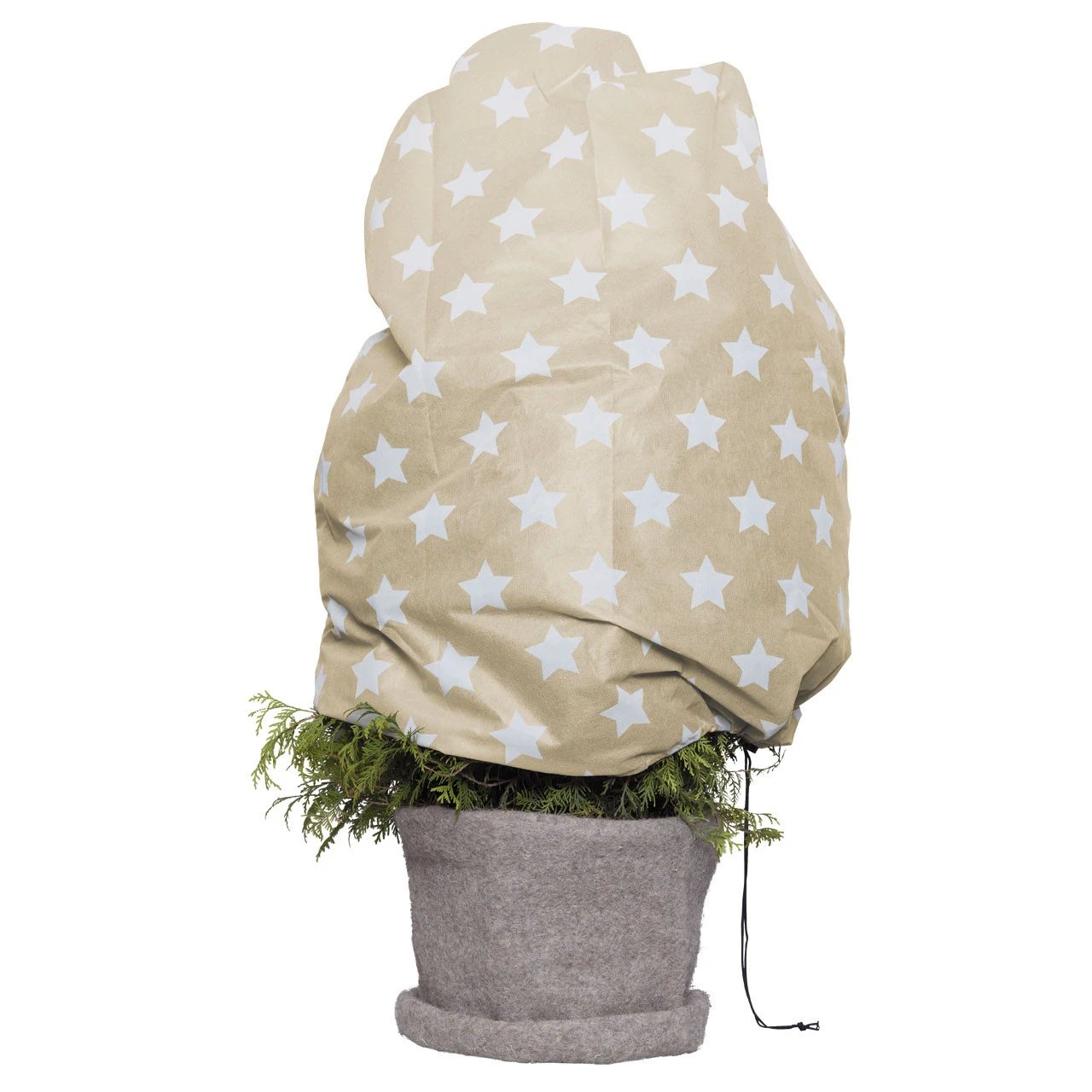 Die zweifarbeige Vlieshaube ist mit festlichen Sternen bedruckt. Die 110 cm hohe und am unteren Rand 110 cm breite Vlieshaube ist für den Winterschutz von Pflanzen geeignet. Die Wintervlieshaube wird einfach über empfindliche Pflanzen gestülpt und mit der Zugkordel im unteren Rand fixiert. Eisige Winde werden gebrochen, der Wechsel zwischen Wintersonne und Frost gemindert.